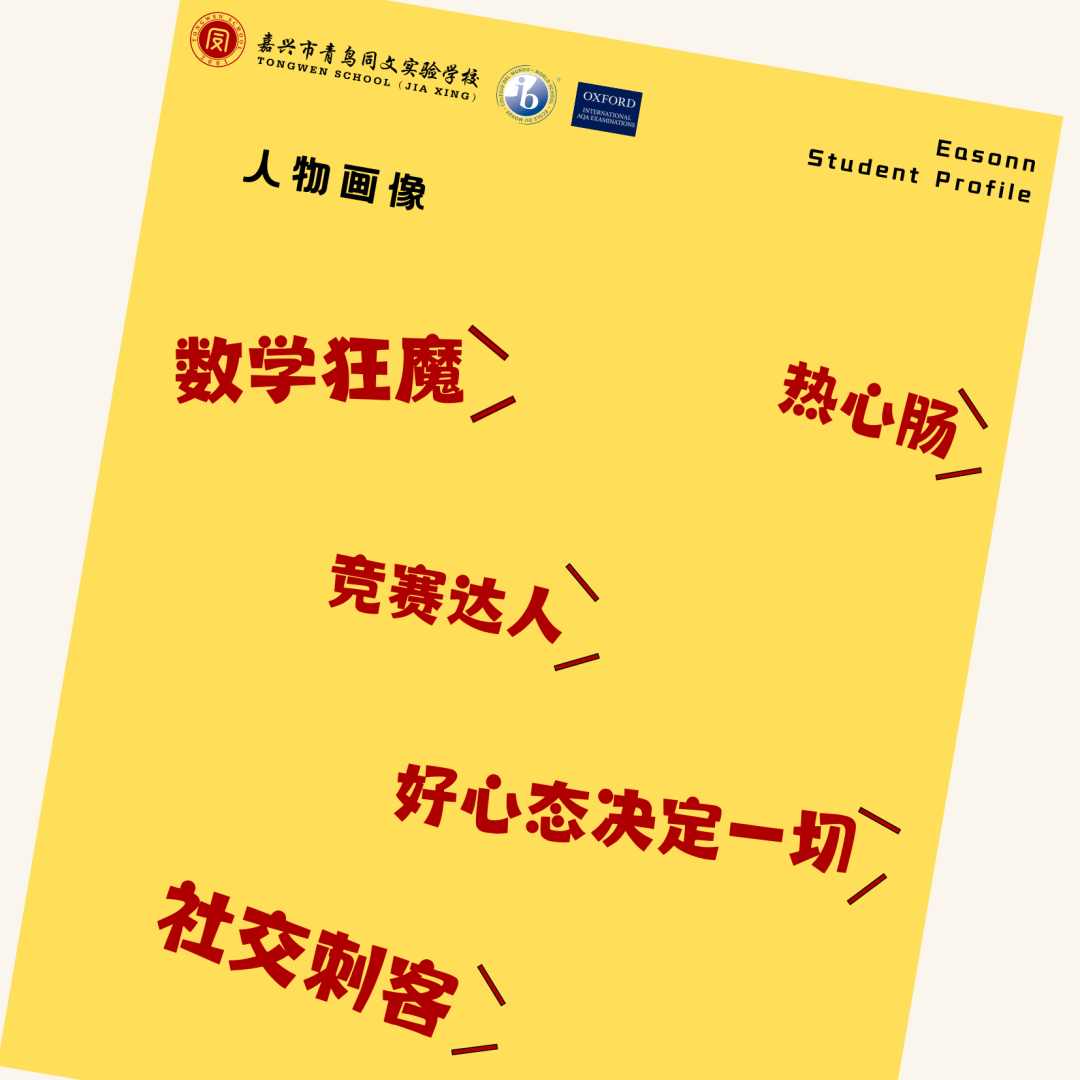 Eason是人盡皆知的數(shù)學(xué)大神。10年級剛開始的時(shí)候他就自學(xué)完了IGCSE所有的數(shù)學(xué)指導(dǎo),并利用晚自修時(shí)間,給同班的六名同學(xué)(??汲煽冊贒)輔導(dǎo)IGCSE數(shù)學(xué),包括幾何、代數(shù)和函數(shù)。所有學(xué)生最后在IGCSE正式考試中都取得了B的成績。11年級的π日,他受邀向小學(xué)生分享了自己的數(shù)學(xué)學(xué)習(xí)經(jīng)驗(yàn),利用卡通的形式將復(fù)雜的數(shù)學(xué)問題簡單化。12年級在各個(gè)DDL的催促下,他每周還會(huì)用一個(gè)晚自修的時(shí)間帶領(lǐng)10年級的學(xué)弟學(xué)妹們打SIC競賽。即使在壓力爆棚的IBDP全球統(tǒng)考考試期間,他仍會(huì)花自己的時(shí)間為同學(xué)耐心地講解數(shù)學(xué)題。