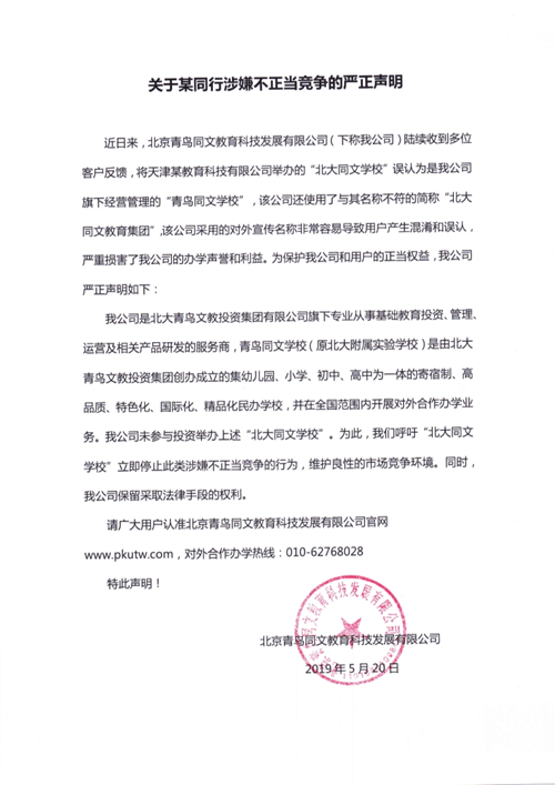 近日來,北京青鳥同文教育科技發(fā)展有限公司(下稱我公司)陸續(xù)收到多位客戶反饋,將天津某教育科技有限公司舉辦的“北大同文學(xué)校”誤認(rèn)為是我公司旗下經(jīng)營管理的“青鳥同文學(xué)校”,該公司還使用了與其名稱不符的簡稱“北大同文教育”,該公司采用的對外宣傳名稱非常容易導(dǎo)致用戶產(chǎn)生混淆和誤認(rèn),嚴(yán)重?fù)p害了我公司的辦學(xué)聲譽(yù)和利益。為保護(hù)我公司和用戶的正當(dāng)權(quán)益,我公司嚴(yán)正聲明如下: